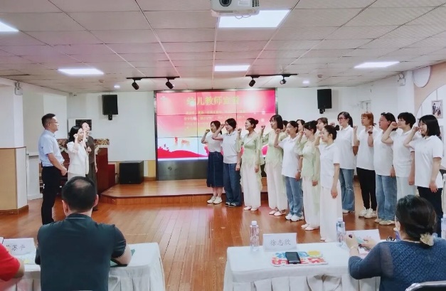 师德,是教师的立身之本;誓言,是师者的初心坚守。在徐主任的监誓下,随着园长领誓,全体教师举起右手,庄严宣读师德誓言。